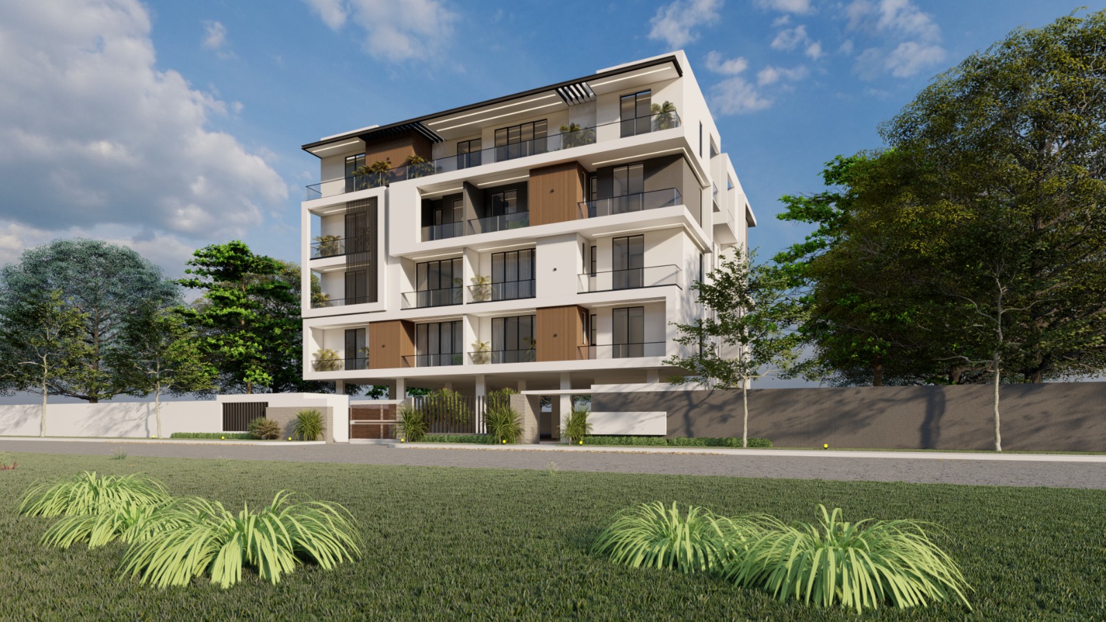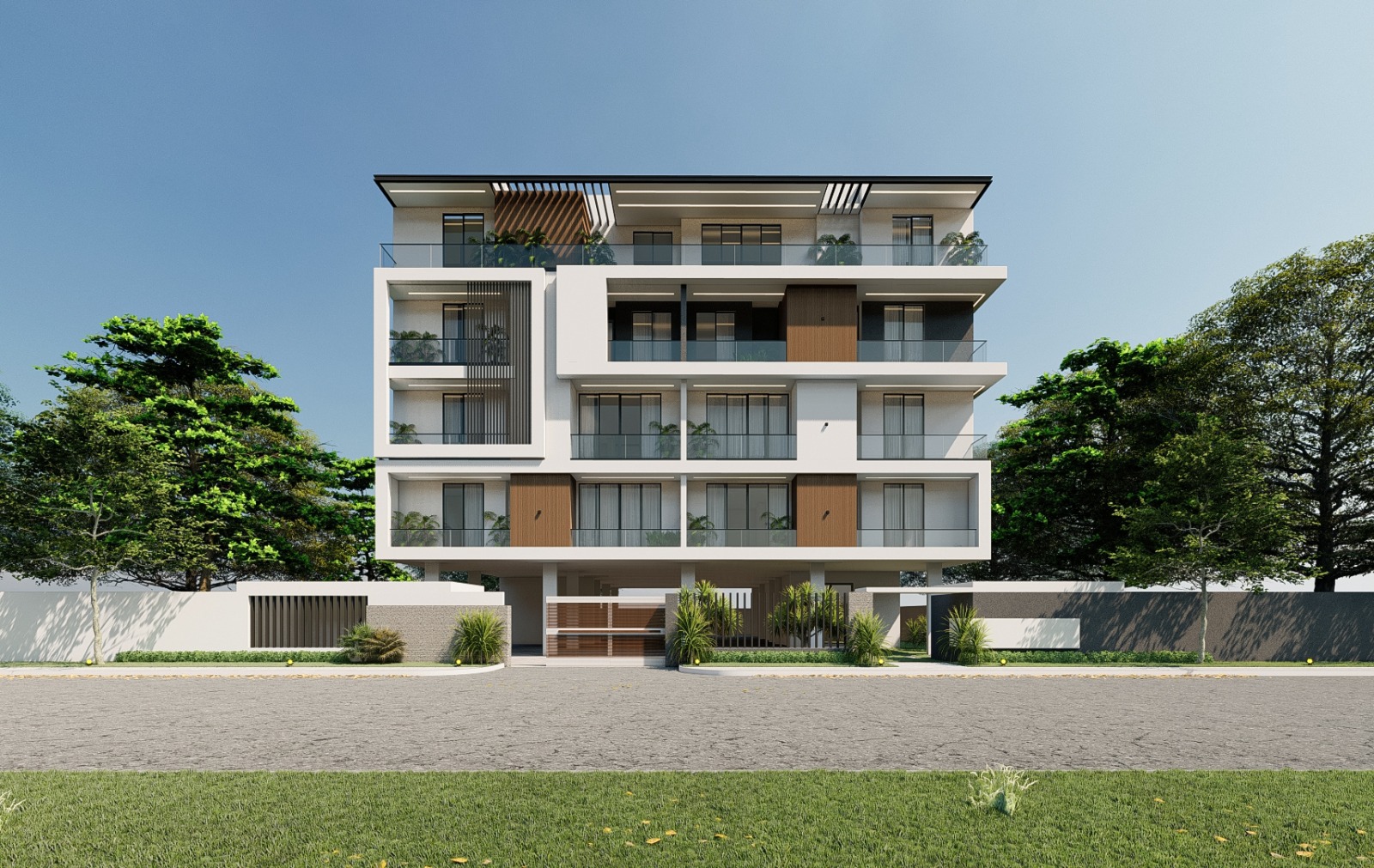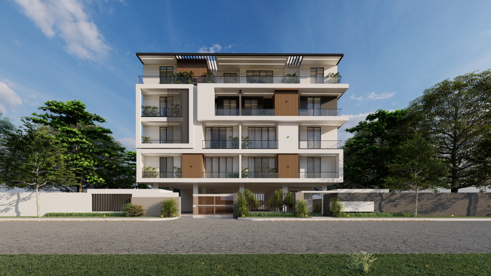 This contemporary residential building presents a refined modern façade defined by clean horizontal lines and balanced proportions. Generous balconies on each level create seamless indoor–outdoor living, while glass railings and warm accent panels add depth and elegance to the design. The structure is thoughtfully framed by greenery, softening its modern expression and enhancing comfort for residents. At ground level, a welcoming entrance and landscaped frontage establish a calm yet sophisticated presence. Designed for functional urban living, the building blends architectural clarity, comfort, and a strong connection to its natural surroundings.