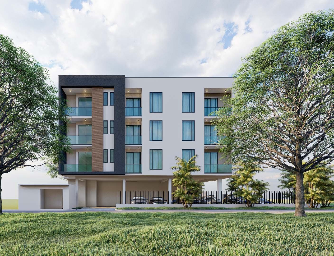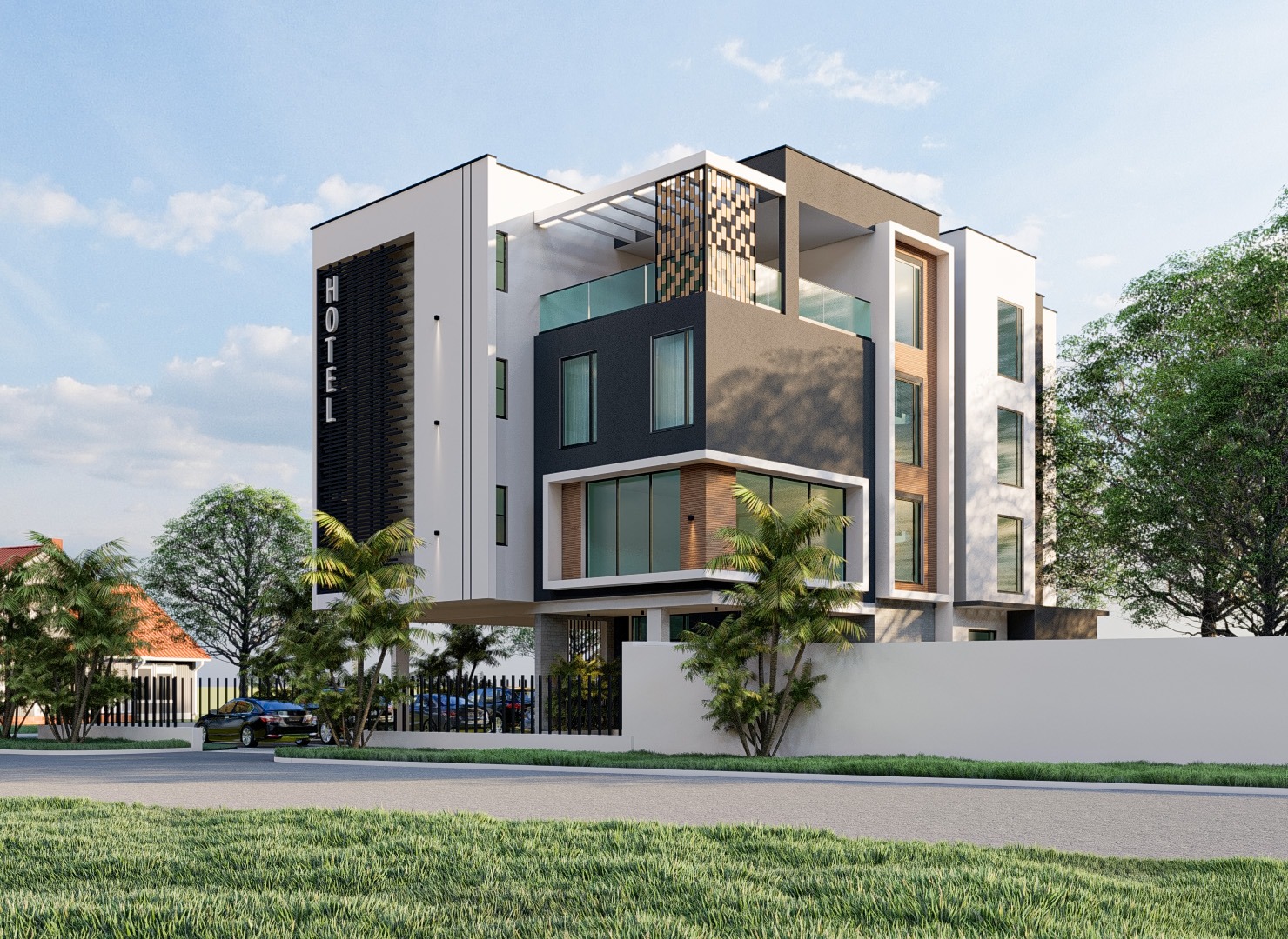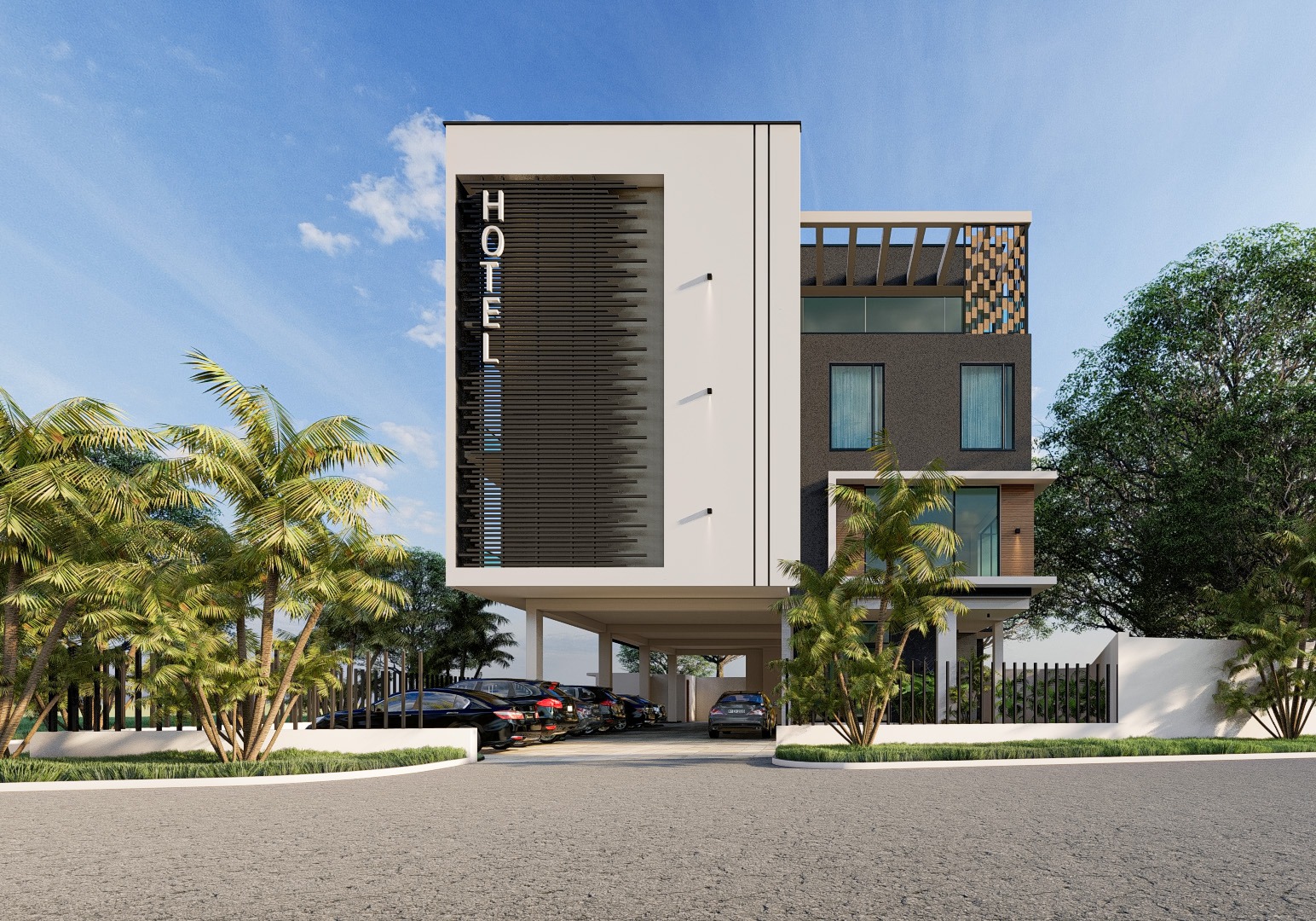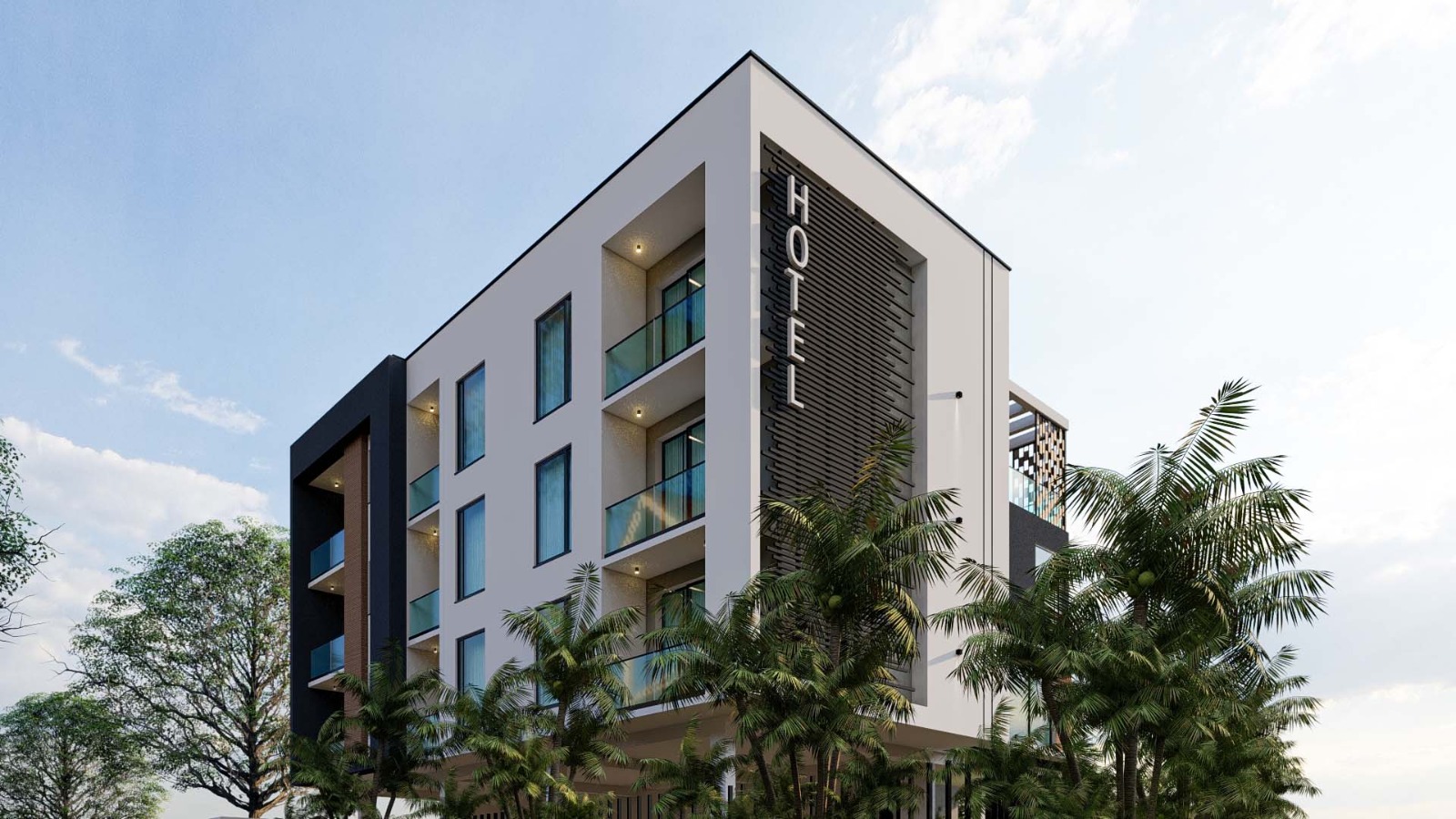 This modern hotel features a sleek contemporary façade with clean lines, glass balconies, and warm textured accents. Designed for comfort and style, it offers a refined urban retreat surrounded by lush landscaping and natural light.