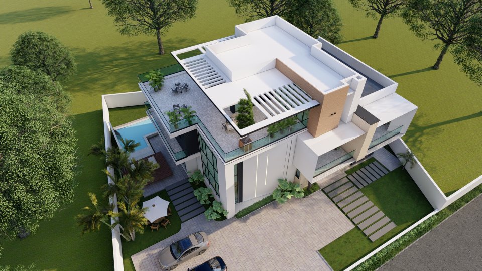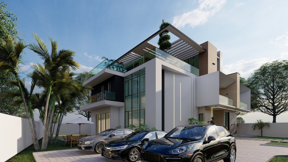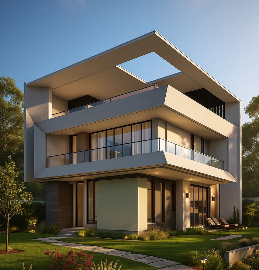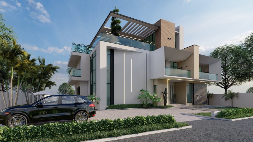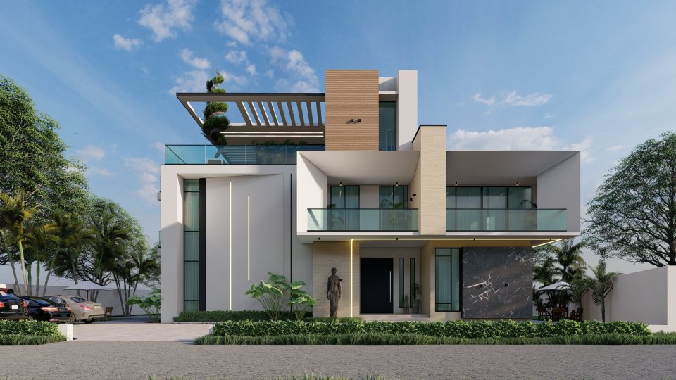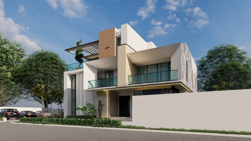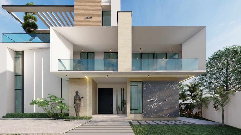 A statement of contemporary luxury, this modern residence blends bold architectural forms with refined materials and expansive glazing to create a striking yet inviting home. Layered volumes, glass balconies, and subtle lighting details enhance its elegance, while lush landscaping and open terraces foster a seamless connection between indoor comfort and outdoor living. Designed for sophistication, relaxation, and modern lifestyle living.